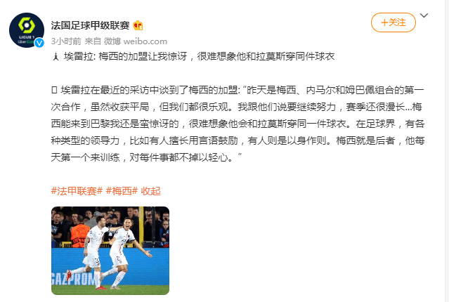 24直播网9月18日讯 法国足球甲级联赛官方微博消息,巴黎圣日耳曼球星埃雷拉称很难想象梅西和拉莫斯穿同一件球衣。