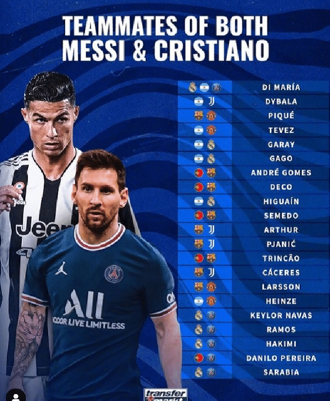 此前,足坛有16人和梅西、C罗都成为过队友,分别是:特维斯、迪玛利亚、迪巴拉、伊瓜因、德科、皮克、塞梅多、戈麦斯、海因策、加雷、加戈、戈麦斯、拉尔森、皮亚尼奇、阿图尔和特康林。当然,能够和梅西、C罗都当过队友的球员又增加了,因为目前巴黎队内有五名球员,此前和C罗做过队友,但是从未和梅西合作过哦。来看看都是谁吧!