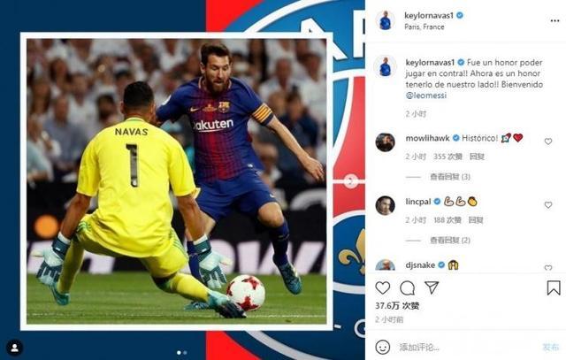 纳瓦斯晒出了他此前在西甲面对梅西时的一张照片,配文道:“能和他交手是我的荣幸!!现在很荣幸有他在我们身边!!欢迎梅西!”