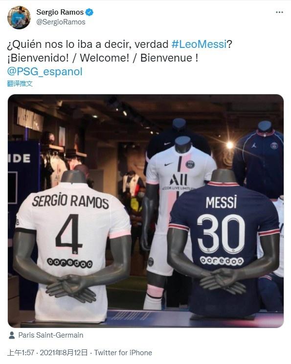 前皇马队长、巴黎今夏新援拉莫斯在推特晒照欢迎前巴萨队长梅西加盟球队。推特中写到:“谁能想得到呢?”并@了梅西。同时他在配文里还用到了西班牙语、英语和法语三种语言的“欢迎”。巴黎官方商店球衣正在热卖,有网友注意到,今夏两名重磅新援梅西与拉莫斯的球衣被摆放在官方商店的最醒目位置。