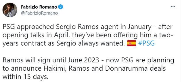 除了拉莫斯之外,根据此前消息,巴黎已经基本完成了阿什拉夫和多纳鲁马的转会,多纳鲁马为自由转会加盟,阿什拉夫的转会费则在7000万欧元左右。