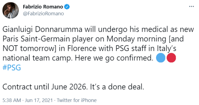 罗马诺表示这笔交易已经完成,没有什么疑问,交易只差体检官宣。多纳鲁马将以自由球员身份加盟巴黎,意味着他的青训球队米兰将不会得到任何转会费。