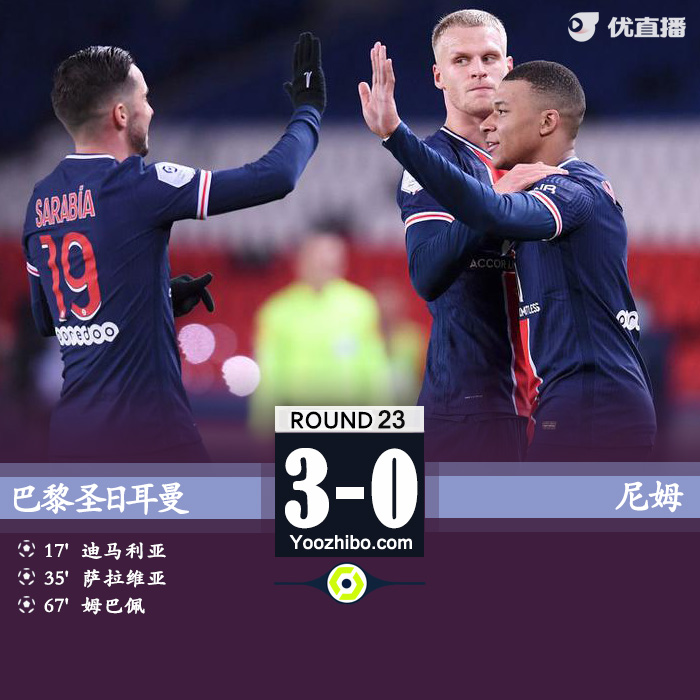 24直播网讯:北京时间2月4号凌晨4:00法甲第23轮巴黎主场对阵副班长尼姆,上半场比赛巴黎全面压制对方,尼姆后卫回传球失误送大礼,迪马利亚断球单刀破门,随后科雷尔头球击中门框,迪马利亚助攻萨拉维亚头球破门得分。里科门线扑出福马近在咫尺的头球,上半场巴黎两球领先。易边再战,尼姆下半场回来逐渐掌握场面主动,但姆巴佩弧线球破门直接杀死了比赛。最终巴黎3-0尼姆拿下本场比赛的胜利。