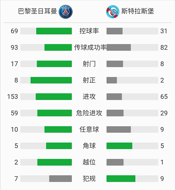 查看:巴黎圣日耳曼vs斯特拉斯堡 全场录像技术统计: