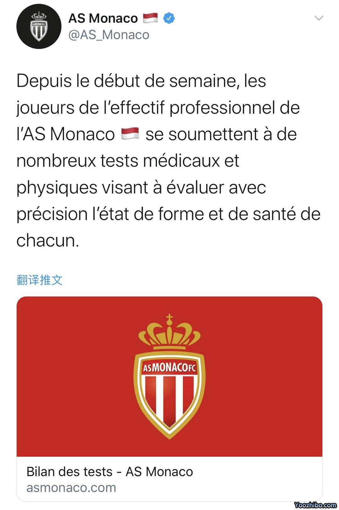 摩纳哥俱乐部在公告中表示,自本周以来,队中球员一直都在接受相关的医学身体检查,目前是准确评估球员的健康状况。此外,为了检查是否感染新冠病毒,俱乐部的职员和球员都还进行了血清学筛查和核酸检测。