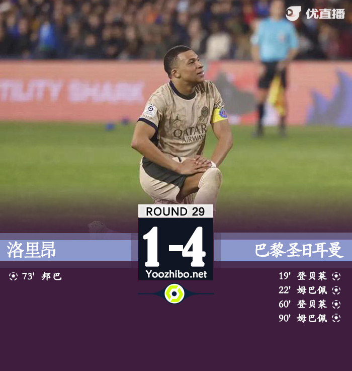 24直播网讯:在法国足球顶级联赛第29轮的比赛中,洛里昂队迎战巴黎圣日耳曼队。上半场登贝莱内切低射破门,随后门德斯传中,姆巴佩门前巧射破门扩大比分。下半场姆巴佩脚下生花,助攻登贝莱破门完成双响,之后班巴头球破门扳回一球,比赛尾声姆巴佩精彩内切破门完成两射一传。最终巴黎4-1战胜洛里昂。