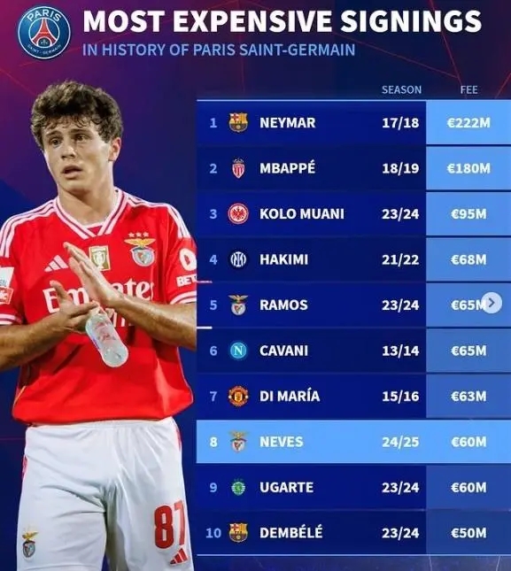 24直播网讯 巴黎官宣以6000万欧基础转会费签下本菲卡后腰内维斯,《转会市场》也更新了巴黎队史引援榜情况(欧元)