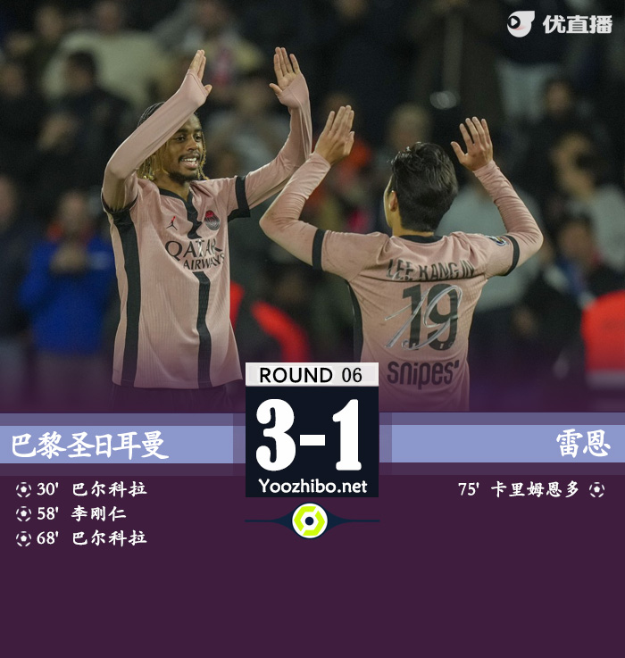 第58分钟,巴尔科拉外围兜射中柱,李刚仁头球补进空门,巴黎2-0雷恩。
