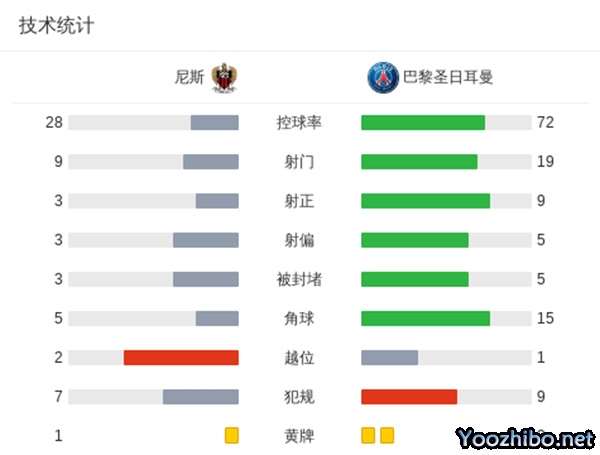 巴黎1-1尼斯跌至第二 努诺-门德斯远射破门马尔基尼奥斯中柱