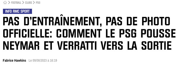 24直播网讯08月10日,来自法国知名媒体RMC的最新消息,法甲霸主巴黎圣日耳曼俱乐部已经告知内马尔、维拉蒂等5人,他们不在俱乐部一线队新赛季的计划中,大巴黎鼓励他们在这个转会窗就转会离开。大巴黎此举,大有要在今夏将“大清洗”进行到底的味道。