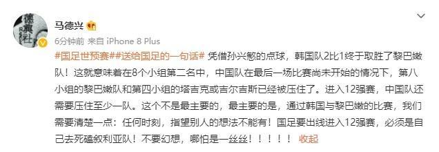 24直播网讯 《体坛周报》记者马德兴表示:“凭借孙兴慜的点球,韩国队2比1终于取胜了黎巴嫩队!这就意味着在8个小组第二名中,中国队在最后一场比赛尚未开始的情况下,第八小组的黎巴嫩队和第四小组的塔吉克或吉尔吉斯已经被压住了。进入12强赛,中国队还需要压住至少一队。这个不是最主要的,最主要的是,通过韩国与黎巴嫩的比赛,我们需要清楚一点:任何时刻,指望别人的想法不能有!国足要出线进入12强赛,必须是自己去死磕叙利亚队!不要幻想,哪怕是一丝丝!!!!!”