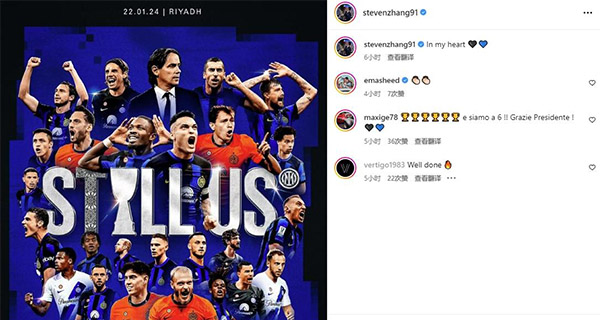 如愿捧杯后,俱乐部主席张康阳也在社交媒体上分享了自己的喜悦,他发布了夺冠庆祝海报,配文“在我心中”并加上了两颗蓝色和黑色的心。对于张康阳而言,这无疑是他执掌国米后取得的又一荣耀,也印证了俱乐部近年来在竞技表现上的延续性。五年间,在张康阳领导的管理层带领下,国米竞技成绩稳步提升,不断创造一个又一个成功的赛季,近三年球队赢得了6座冠军奖杯,包括1次意甲联赛冠军、2次意大利杯冠军和3次意大利超级杯冠军,这6座冠军奖杯,也让张康阳跻身队史第三成功的主席,仅次于安吉洛-莫拉蒂(7次冠军)和马西莫-莫拉蒂(11次冠军)。另外2次晋级欧战决赛则证明了球队世界顶尖的竞技实力,尤其上赛季, 国米时隔13年再次晋级欧冠决赛,创造了三冠王赛季后在欧战上取得的最好战绩。