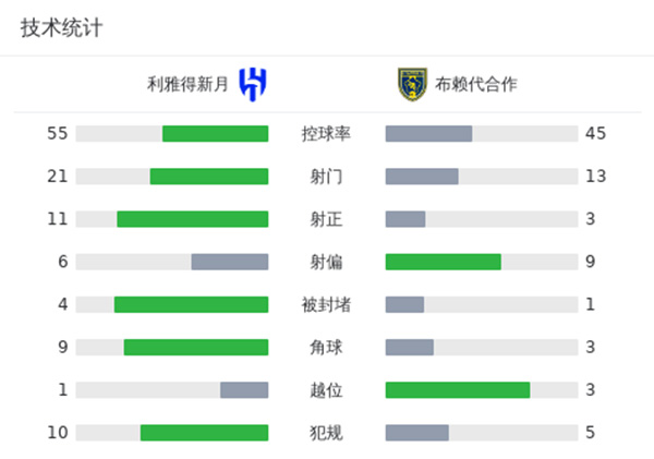 全场比赛结束,利雅得新月3-0布赖代合作。