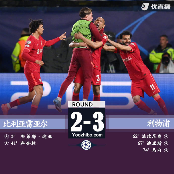24直播网讯5月4日讯 北京时间5月4日凌晨3点整,2021-22赛季欧冠半决赛次回合在陶瓷球场展开角逐,利物浦客场挑战比利亚雷亚尔。上半场迪亚首开纪录,科奎林头球建功,下半场法比尼奥扳回一城,迪亚斯替补扳平,马内反超比分,卡普埃染红。最终利物浦客场3-2逆转比利亚雷亚尔,总比分利物浦5-2淘汰比利亚雷亚尔晋级欧冠决赛。