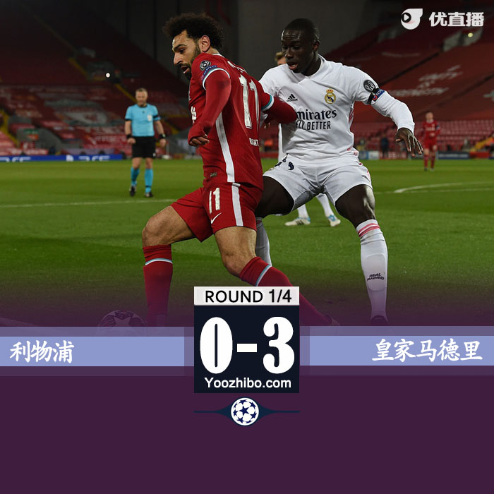 24直播网4月15日讯 北京时间04月15日星期四03:00,欧冠1/4决赛次回合利物浦主场迎战皇家马德里。上半场,库尔图瓦扑出萨拉赫单刀,本泽马射门折射中柱,红军狂攻无果,利物浦半场暂0-0皇马。下半场,双方互有攻守皆无明显破门机会。最终,皇马0-0总分3-1利物浦,晋级四强将对阵切尔西。