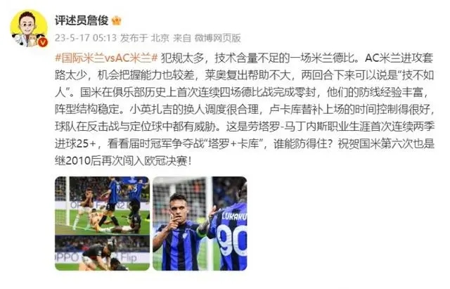 24直播网04月17日讯 3:00,欧冠半决赛次回合米兰德比,国米1-0战胜米兰,总比分3-0晋级决赛。赛后著名足球评述员詹俊发文评价了本场比赛:犯规太多,技术含量不足的一场米兰德比。