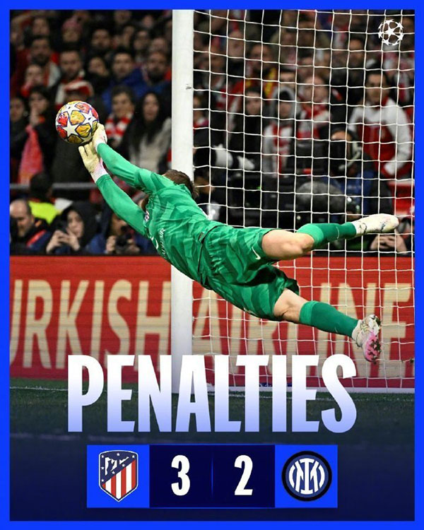 在北京时间3月14日凌晨结束的欧冠1/8决赛次回合最后1场角逐中,意甲领头羊国际米兰在点球大战中失利,总比分4-5被马德里竞技挡在了8强之外。上届亚军就此告别本赛季欧冠。
