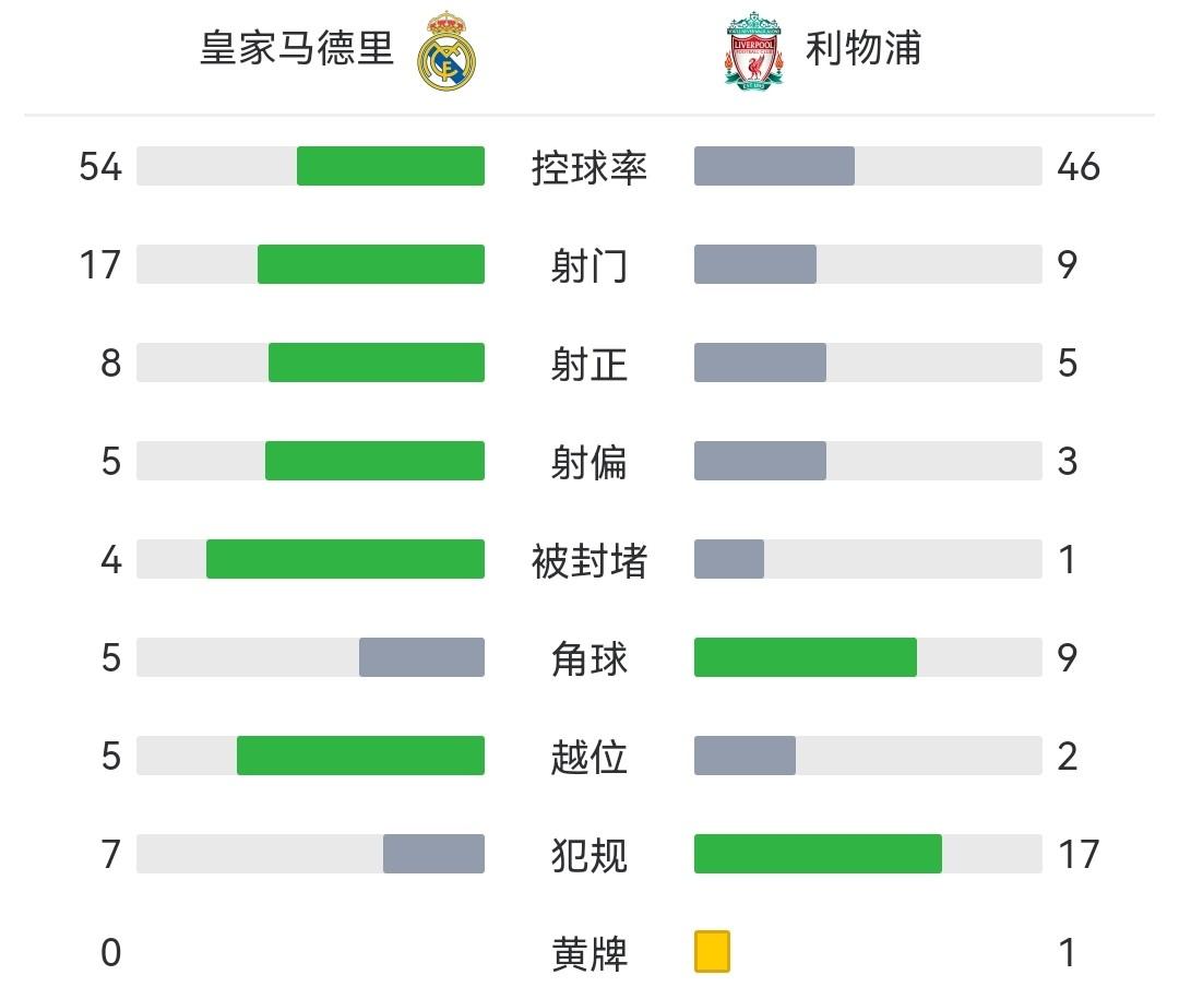 全场比赛结束,皇马主场1-0,两回合总比分6-2战胜利物浦晋级8强。