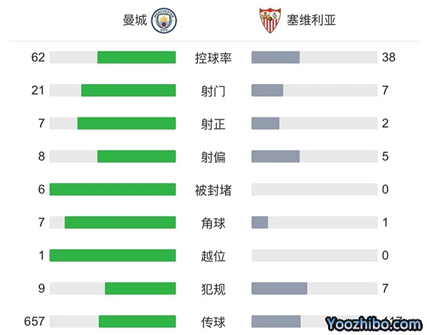 全场比赛结束,曼城3-1塞维利亚。