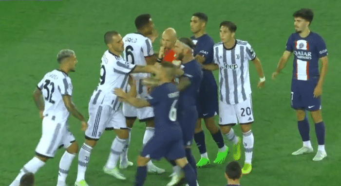 另外本场比赛也是发生了火爆冲突,上半场的比赛踢了23分钟多的时间,姆巴佩在一次进攻的过程中被对手犯规放倒,痛苦倒地,随后拉莫斯替姆巴佩抱平,随后与帕雷德斯发生冲突,拉莫斯锁喉帕雷德斯,博努奇一把直接推开了拉莫斯,随后两边的球员迅速聚集到了一起,好在是被及时拉开,冲突没有进一步的扩大。