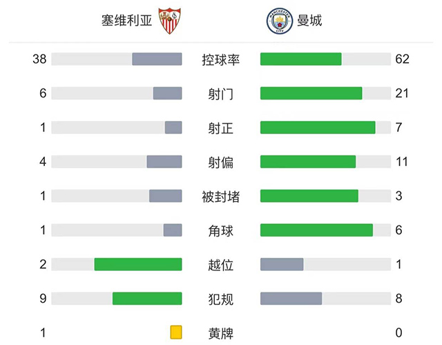 第20分钟,曼城取得进球!福登斜传德布劳内右路禁区下底传中门前哈兰德跟上飞身踹射破门。曼城客场1-0塞维利亚。