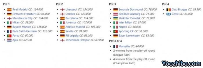 第1档:皇马、法兰克福、曼城、AC米兰、拜仁、巴黎、波尔图、阿贾克斯