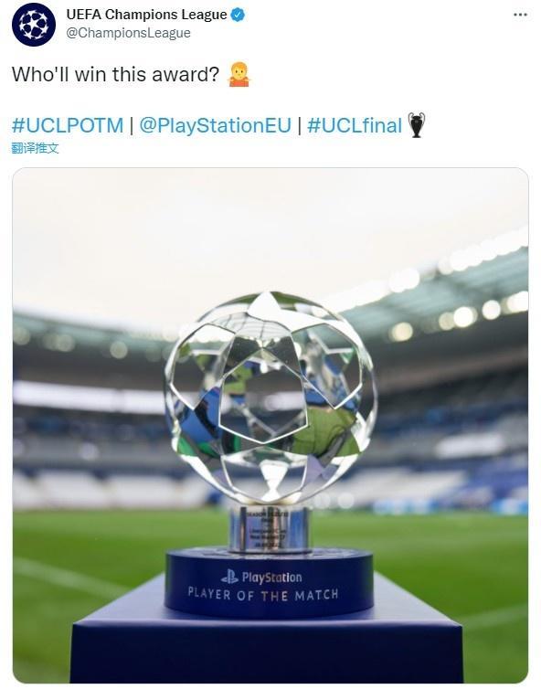 赛前,欧冠官推也晒出了决赛最佳球员奖杯的照片,并配文:“谁将赢得该奖项?”