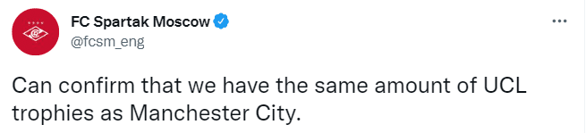 赛后莫斯科斯巴达克俱乐部官推写道:“可以证实我们和曼城有一样多的欧冠冠军!”