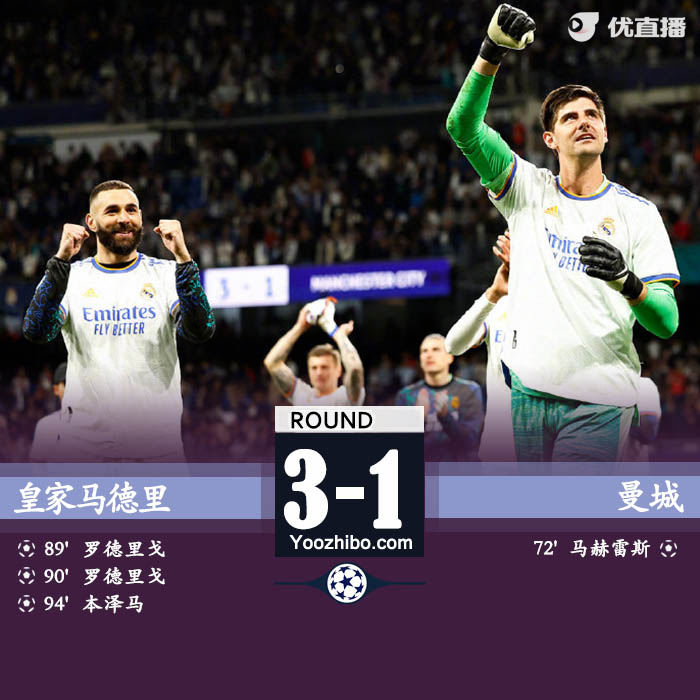 24直播网讯:北京时间5月5日03:00,欧冠半决赛次回合,皇家马德里坐镇主场迎战曼城,首回合曼城主场4-3取胜占先机。上半场,库尔图瓦先后化解了B席的小角度劲射和福登的远射攻门,卡塞米罗两度身后犯规都未吃牌。下半场,沃克伤退,B席助攻马赫雷斯打破僵局;随后场上风云突变,替补登场的罗德里戈终场前91秒头顶脚踢连入两球力挽狂澜瞬间扳平总比分。加时赛中,本泽马造点并亲自操刀一锤定音。库尔图瓦屡献逆天扑救,当选本场最佳球员。最终,皇马总比分6-5奇迹逆转曼城,与利物浦会师欧冠决赛!