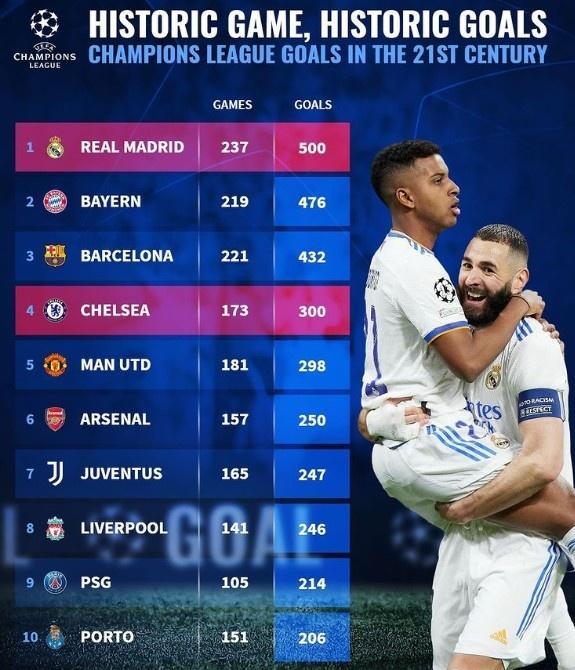 24直播网04月14日讯 北京时间今天,德转统计了21世纪各球队欧冠进球数,皇马500球高居第一位。拜仁、巴萨位列二三名。