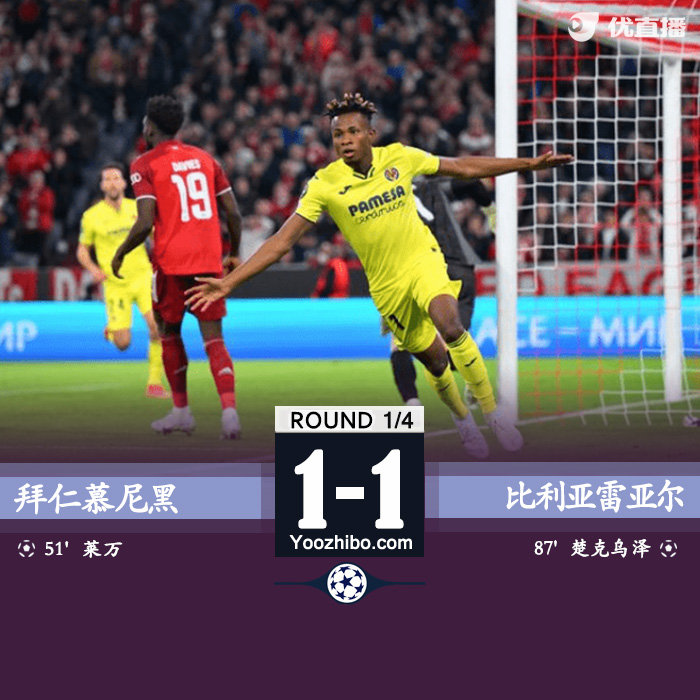 全场比赛结束,拜仁慕尼黑1-1比利亚雷亚尔,总比分拜仁1-2被黄潜淘汰。