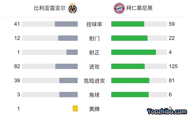 全场比赛结束,比利亚雷亚尔1-0拜仁慕尼黑。