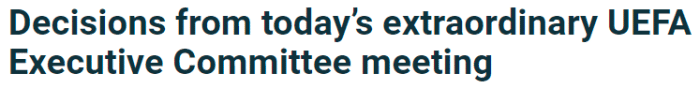 此外,欧足联还宣布俄罗斯、乌克兰的国家队、俱乐部赛事的主场比赛将改在中立场地进行。