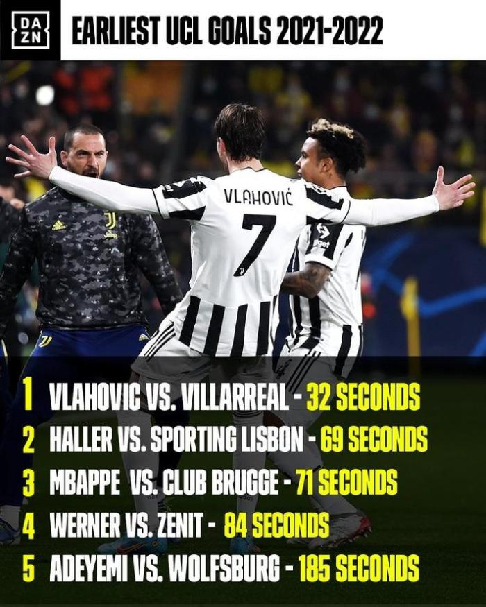 24直播网02月23日讯 据DAZN数据统计,弗拉霍维奇对比利亚雷亚尔的进球是本赛季欧冠最快的进球。