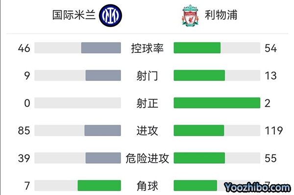 全场比赛结束,国际米兰0-2利物浦。