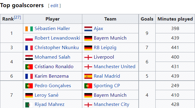 7(并列)、贡萨尔维斯(葡萄牙体育)、萨内(拜仁)、马赫雷斯(曼城),4球