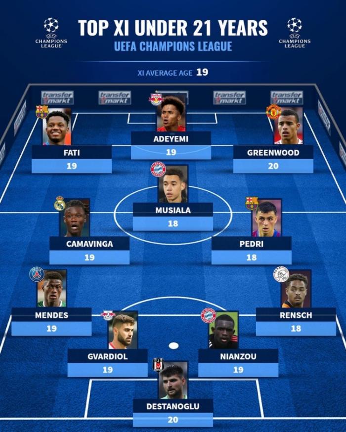 33岁以上的阵容在足坛可以说是叔叔级别的阵容了,那么U21的年轻阵容怎么样呢?德转评选的欧冠U21以下最佳阵容平均年龄只有19岁,都是各大球队的超新星。门将位置上是贝西克塔斯队内20岁的门将德斯坦诺格鲁;后防线上是19岁的门德斯、19岁的格瓦迪奥尔、19岁的夸西和18岁的伦斯;中场方面分别是19岁的卡马文加、18岁的穆西亚拉和18岁的佩德里。而前场三叉戟是19岁的法蒂、19岁的阿德耶米和20岁的格林伍德,这些球员也都是各大球队的未来。