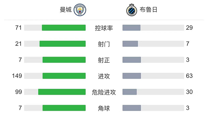 全场比赛结束,最终曼城4-1击败布鲁日。