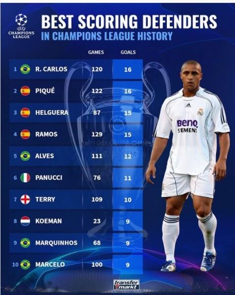 24直播网讯 足坛有很多带刀后卫,他们在比赛中能够打进很多球,而在欧冠赛场上当然少不了带刀后卫,那么在欧冠历史上,哪些后卫的进球最多呢?近日,德国权威媒体《转会市场网》盘点了欧冠历史上后卫进球排行榜,其中巴西后卫罗伯特卡洛斯和西班牙后卫皮克位居榜首,两人在欧冠赛场上的进球都达到了16球,而足坛著名的带到后卫拉莫斯只排名第四。话不多说,一起看内容。
