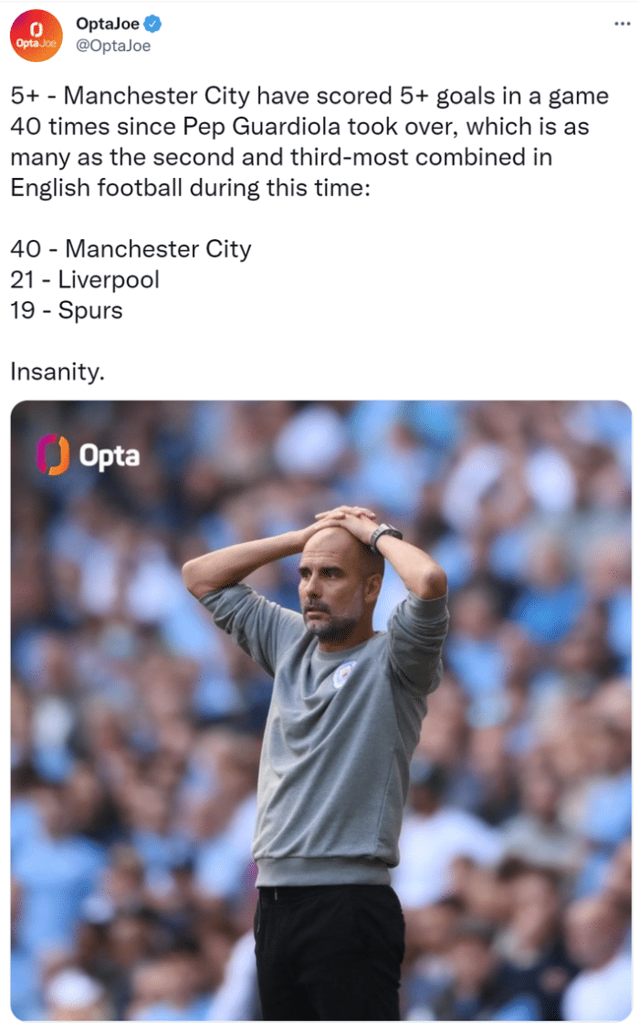自从瓜迪奥拉成为曼城主帅之后,曼城各项赛事已有40次单场打进5球或以上,是同期第二和第三名球队次数相加之和(利物浦21次,热刺19次)。