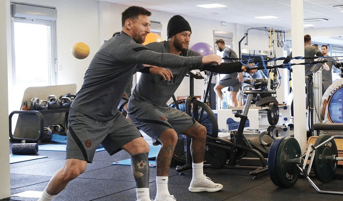 梅西也在赛前发布了两张自己和队友一起训练的照片,与姆巴佩踢球、与内马尔一起在健身房锻炼。