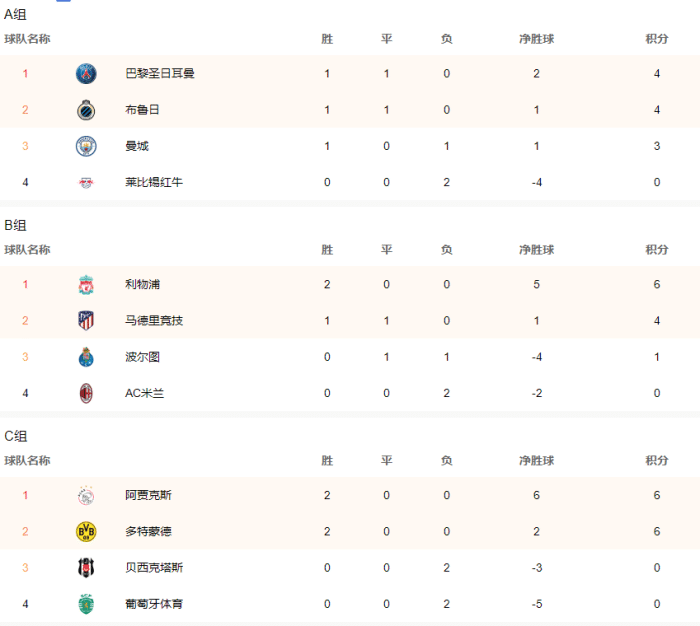 24直播网9月30日讯 ,欧冠小组赛第二轮全部完赛,各大豪门状态不一,A组的巴黎圣日耳曼2-0完胜曼城、布鲁日2-1击败莱比锡;B组的利物浦5-1大胜波尔图、马竞2-1击败AC米兰;C组的阿贾克斯2-0击败贝西克塔斯、多特蒙德1-0击败葡萄牙体育;D组的蒂拉斯波尔警长2-1击败了皇马、国米0-0踢平顿涅茨克矿工;E组的拜仁5-0大胜基辅迪纳摩、巴萨0-3输给本菲卡。