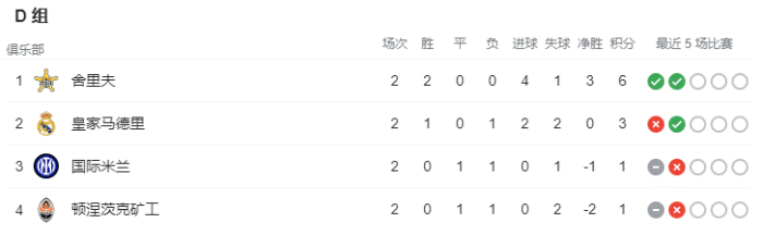 D组爆了大冷门,欧冠新军谢里夫两战两胜,连克矿工和皇马后积6分排名第一。皇马1胜1负3分排名第二,国米和矿工则1平1负积1分,因净胜球关系分列三四位。