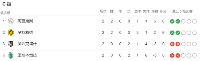 C组第二轮阿贾克斯2-0击败贝西克塔斯,加上首轮5-1大胜葡萄牙体育,现在他们6个净胜球6分排第一,多特蒙德本轮1-0击败葡萄牙体育同样取得两连胜排名第二。贝西克塔斯和葡萄牙体育均积0分,因净胜球关系分列三四位。