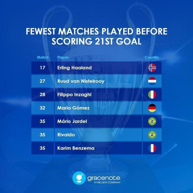 根据数据统计,哈兰德的历史上最快达成欧冠21球里程碑的球员,比第二名的范尼斯特鲁伊快了足足10场。另外,曼城是至今唯一一个哈兰德无法攻破大门的欧冠对手。