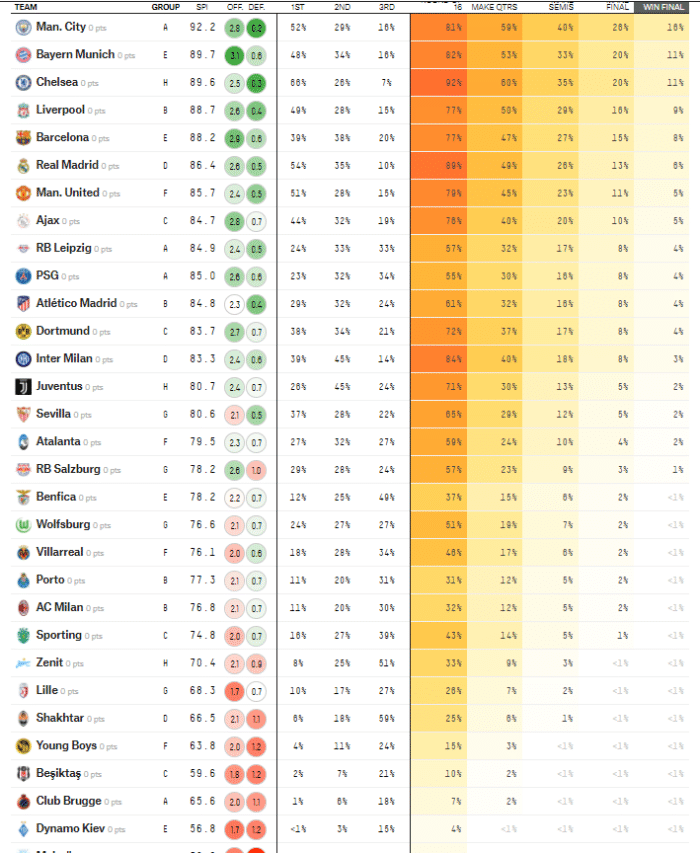 如图,曼城是最被看好的球队,他们进入16强几率是81%,8强是59%,4强是40%,决赛是26%,夺冠几率是16%,看来大数据认为曼城才是大热门。