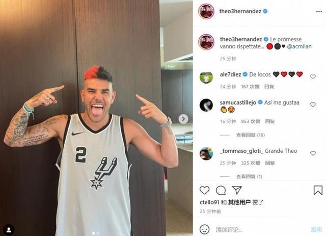 如今,他遵守了自己的承诺。AC米兰左后卫特奥-埃尔南德斯更新了自己的Instagram动态,图中身披NBA马刺2号球衣的特奥展示了自己的红黑配色发型,并配文表示:“承诺必须要遵守!”