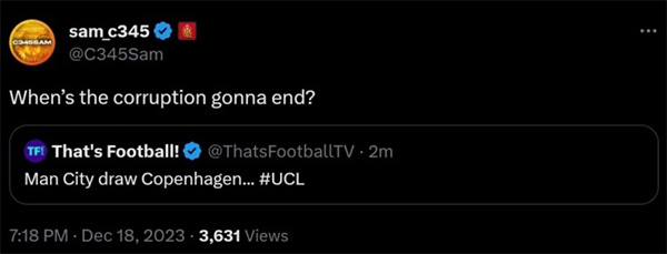 曼城能够如此好运,让专注于爆料英超转会及球员消息的博主Sam-C345进行了吐槽。这名博主转发了曼城将对阵哥本哈根的新闻,并写道:“腐败(corruption)究竟什么时候能停止?”