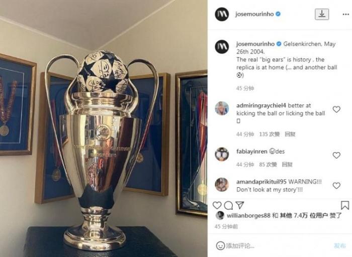 24直播网讯 近日,穆里尼奥在INS上晒照,展示了2004年率领波尔图夺得欧冠的奖杯复制品以及签名足球。