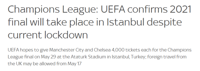 欧足联希望至少分给曼城和切尔西每家各4000张球票。欧足联本来想允许球场容量(75000人)一半的观众入场,但疫情期间观众人数可能会减少。